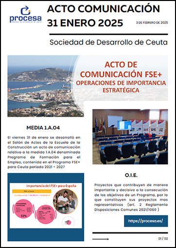 El pasado 31 de enero, el Salón de Actos de la Escuela de la Construcción de Ceuta (gestionada por PROCESA), acogió la presentación de los principales proyectos que contiene el Programa del Fondo Social Europeo Plus (FSE+) para Ceuta período 2021-2027, denominados ‘operaciones de importancia estratégica’ (OIE), y entre los que se incluyen los programas mixtos de empleo y formación, el refuerzo educativo para menores con necesidades especiales, el de empleo para jóvenes y el programa de salud bucodental, todas actuaciones cofinanciadas por el FSE+.